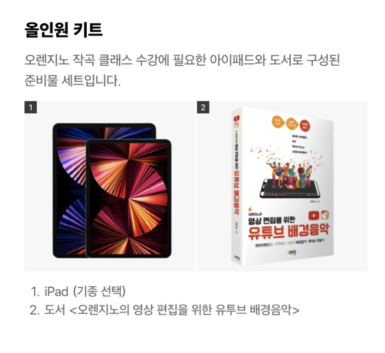 준비물 키트는 오렌지노 올인원 키트로도 구매가 가능하네요. 이번 기회에 아이패드도 함께 구매하시는 것도 좋을듯합니다.