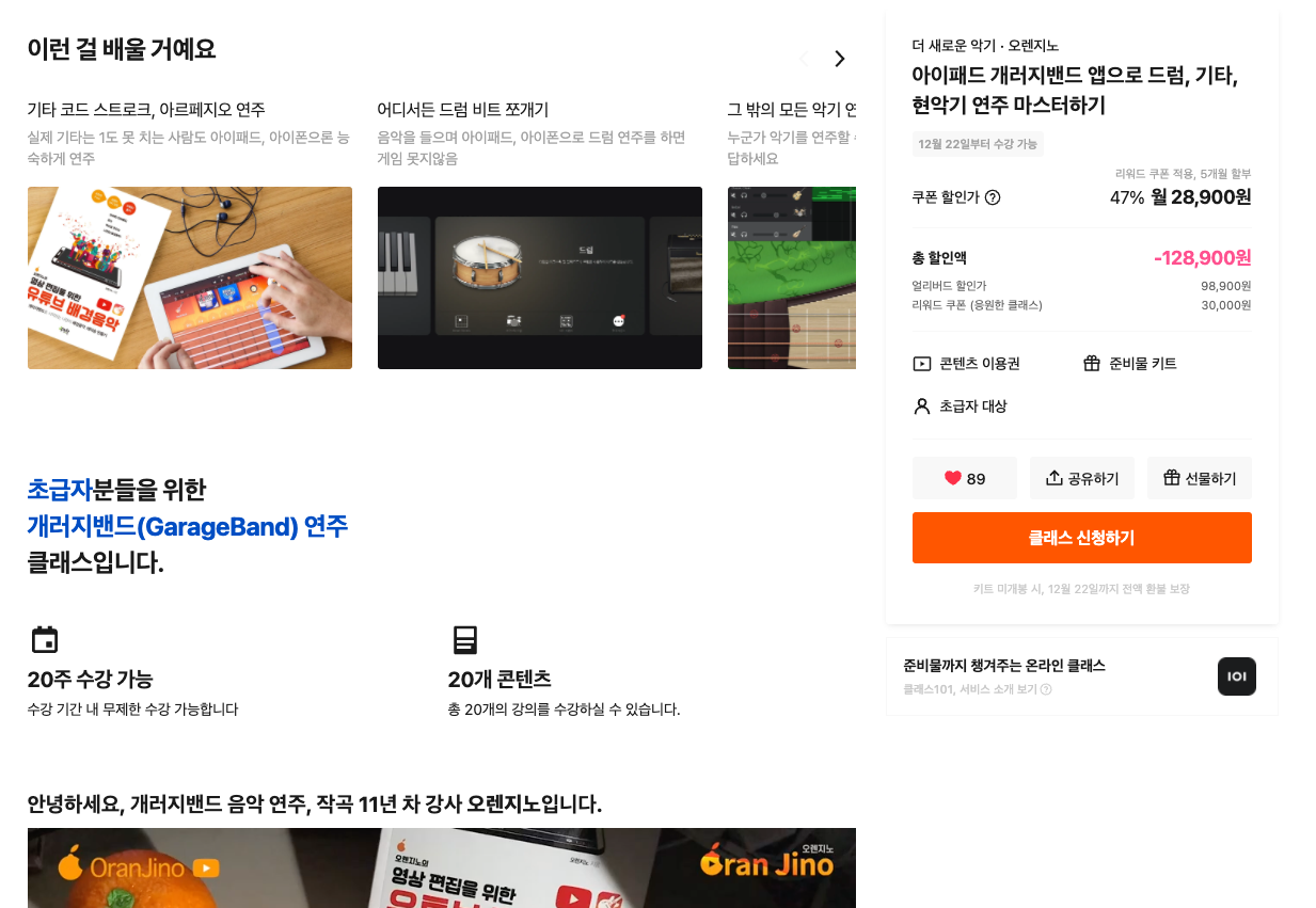 우리나라 온라인클래스 플랫폼 1위인 class101은 TV 광고도 진행하면서 많은 분들이 취미 강의를 배우고 있는 곳입니다. 11년차 아이폰, 아이패드 개러지밴드 음악 강사인 저 오렌지노의 강의도 이번에 클래스101에 얼리버드 오픈을 하게 되었습니다.