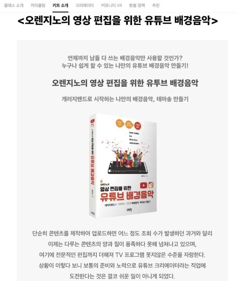 총 20개의 강의로 구성되어 있습니다. 최근 덕성여대, 한양대에서도 진행하는 등 11년간 각종 교육기관과 기업에서 해온 강의 중 연주에 특화하여 알차게 구성했습니다. 개러지밴드 가이드북인 저의 저서, '오렌지노의 영상 편집을 위한 유튜브 배경음악 - 개러지밴드로 시작하는 나만의 배경음악, 테마송 만들기'의 저자 직강입니다.