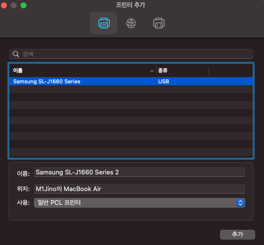 결론은 드라이버를 HP 데스크젯 1000 J110 시리즈로 잡아야 합니다. 그러기 위해서 일단 맥의 환경설정에서 '프린터 및 스캐너'를 열고 새로 장치를 추가합니다. 그러면 이렇게 Samsung SL-J1660 Series를 찾죠