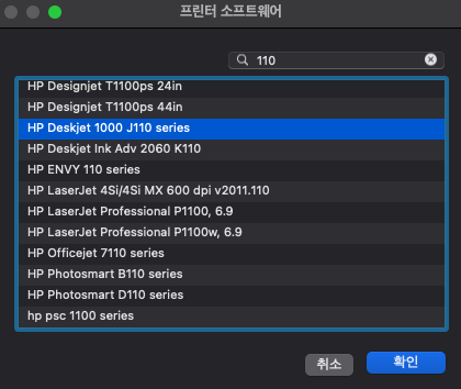 설치 후 이렇게 HP 1000 J110으로 소프트웨어를 선택해준 후 프린트를 해보니 잘 됩니다!!!