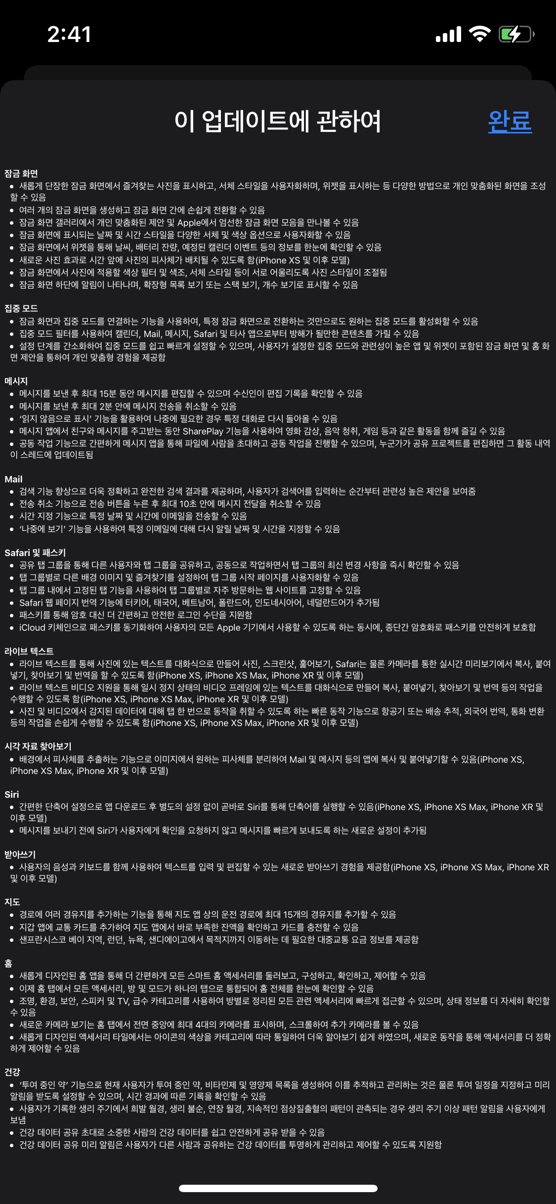 잠금화면, 집중 모드, 메시지, 메일, 사파리 및 패스키, 라이브 텍스트, 시각 자료 찾아보기, 시리 siri, 받아쓰기, 지도, 홈 앱, 건강 앱, 가족 공유 안전 점검, 손쉬운 사용 등이 이번 업데이트 개선사항입니다.