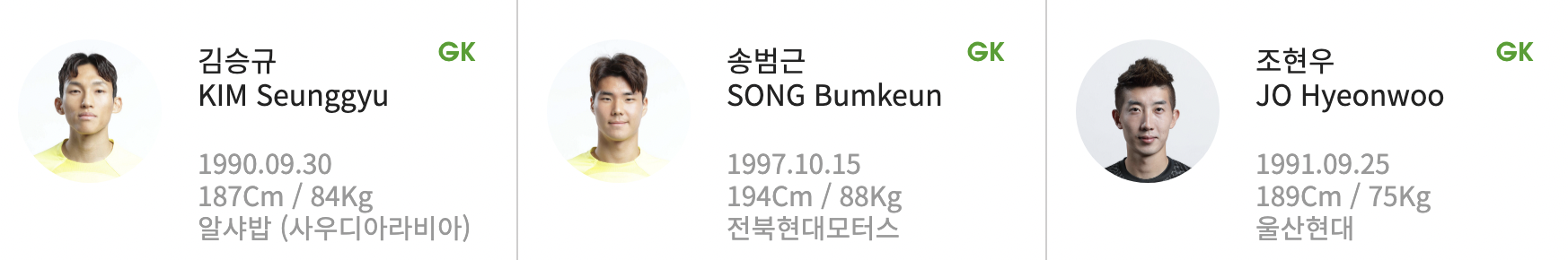 골키퍼는 김승규, 조현우, 송범근입니다.