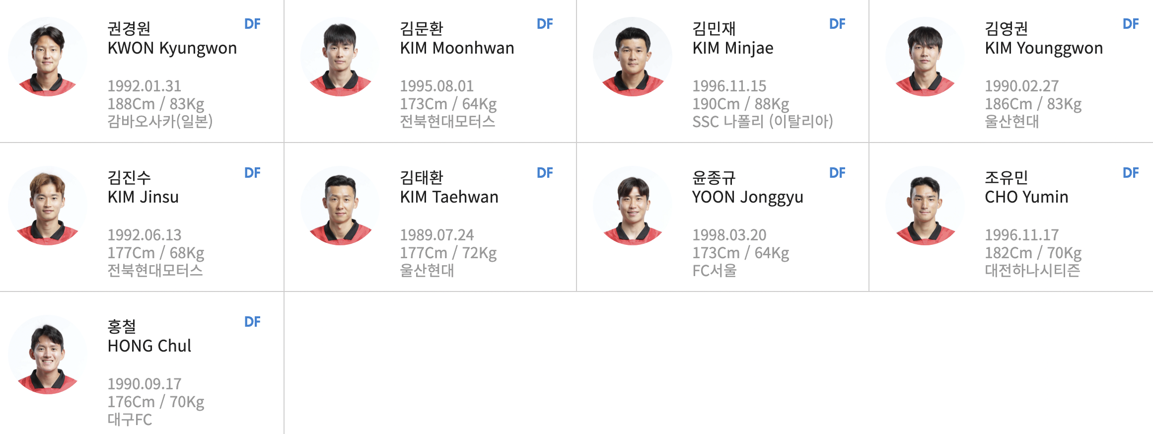수비진은 든든한 김민재를 포함한 9명의 선수가 있습니다. 부상중인 김진수의 빠른 회복을 기원합니다.