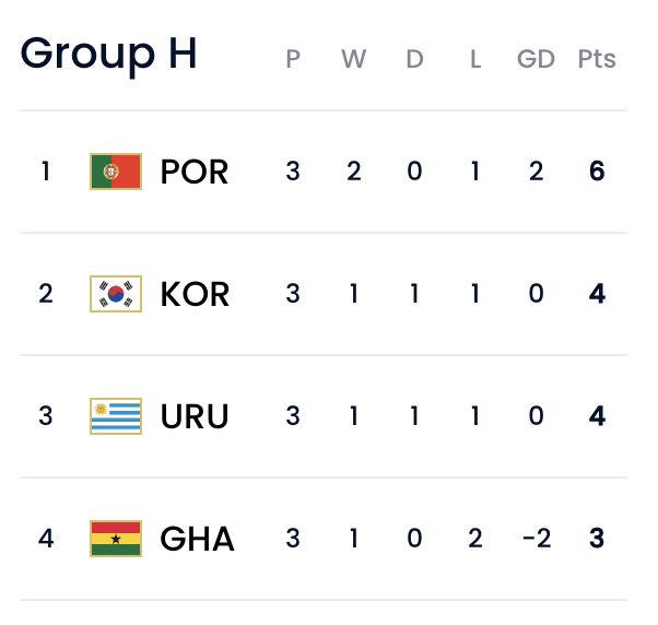 카타르 2022 월드컵에서 기적적으로 대한민국이 그 어려운 경우의 수를 뚫고 16강에 진출했습니다. 전제 조건이 포르투갈을 이기는 것이었고 그 다음 우루과이가 이기거나 우루과이 가나가 비겨서 승점 동률을 만든 후 골득실로 2위가 되어야 했습니다.