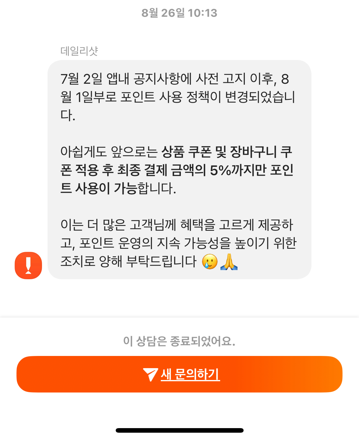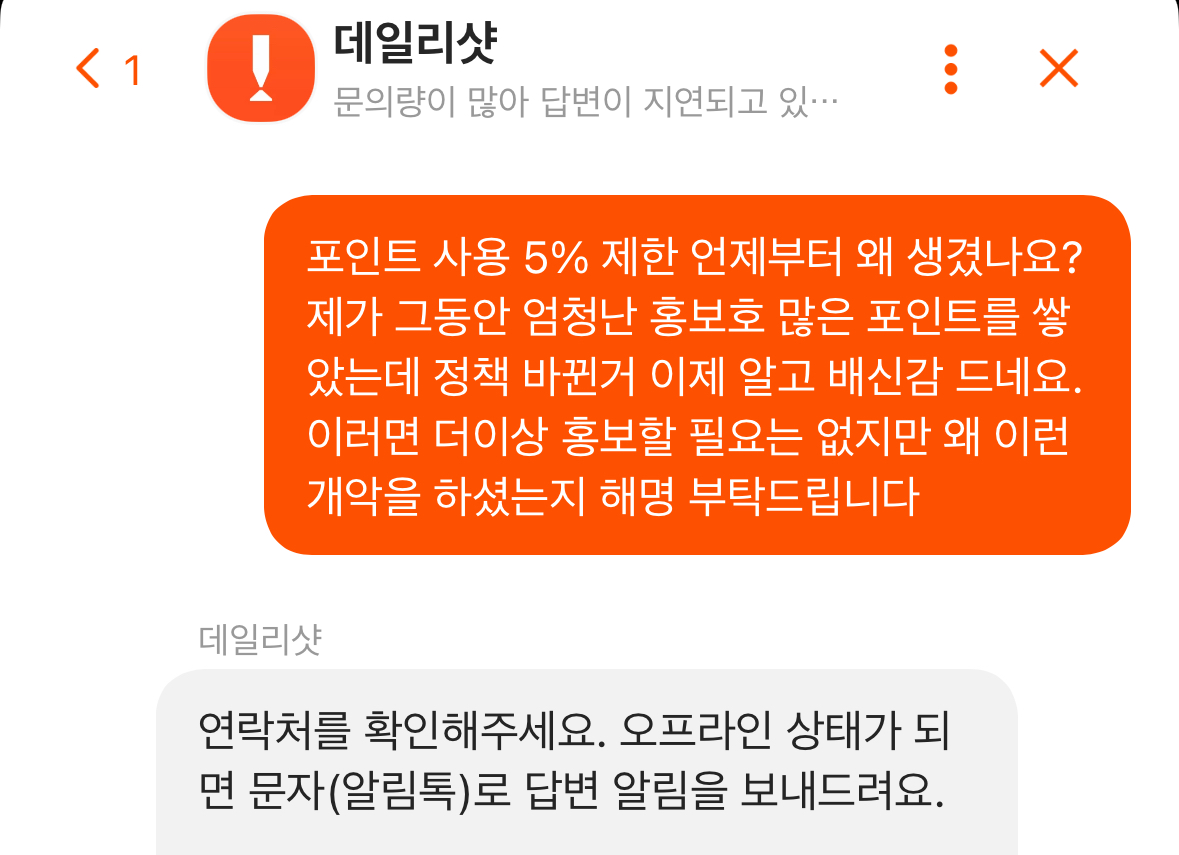 저는 바로 데일리샷 고객센터에 항의성 문의를 했습니다.