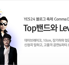 티스토리 공지에 이벤트가 떴습니다. http://notice.tistory.com/1683 Top밴드와 Level Up파티!라고 하네요. YES24의 블로그 축제 Comma Day~ 데이브레이크, 10cm, 장기하와 얼굴들, 일단은 준석이들 출연! 내용은 아래와 같습니다. Level Up Party? 일시 : 2011년 10월 13일(목), PM 8:00 ~ 10:10 장소 : 디큐브 아트센터 7F (D-CUBE ARTS CENTER) 출연 뮤지션 : 데이브레이크, 10cm, 장기하와 얼굴들, 일단은 준석이들 사전 이벤트. 기부 & take 행사 당일 책 1권이상 기부하면, 타로 점과 깜짝 서비스 제공 엔딩이벤트 1. istyle24의 NYbh의류, 축제도서, 영화예매권 등 경품 추첨 2. 드레스 코드를..