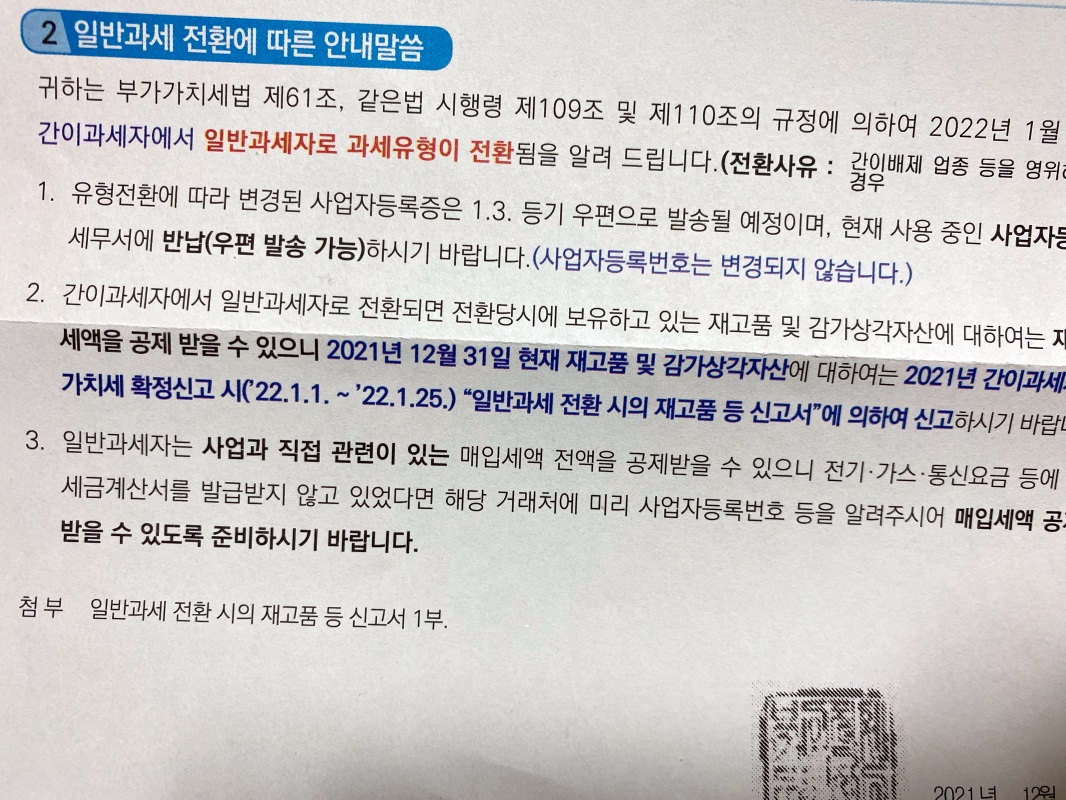 국세청으로부터 등기가 도착했는데, 일반과세자 전환통지서라고 되어있습니다. 처음엔 부재중으로 받지 못하였다가 홈택스에서 우편물 조회를 해도 무슨 등기인지 알 수 없어 세무서와 통화를 해서 알게 되었던 내용입니다.