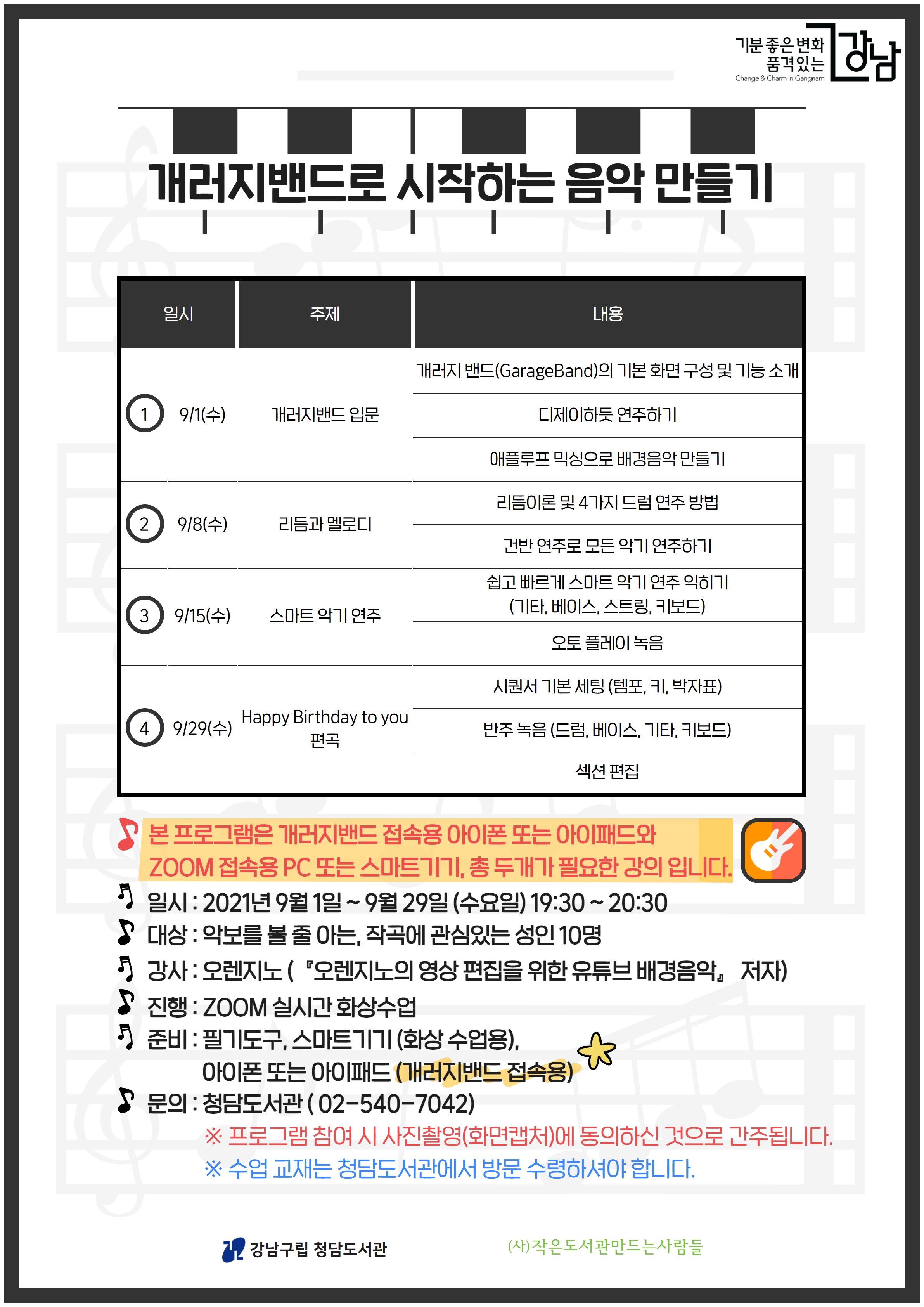 수업 교재 '오렌지노의 영상 편집을 위한 유튜브 배경음악 - 개러지밴드로 시작하는 나만의 배경음악 테마송 만들기'는 청담도서관에서 방문 수령하셔야 합니다.