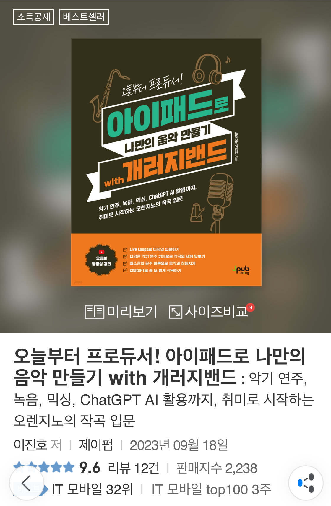 이 아이패드 개러지밴드, AI 작곡 책 출간 이후 IT 모바일 Top 100에 3주 연속 랭크하였고 어제 기준 베스트셀러 32위까지 올라갔네요. 감사합니다!