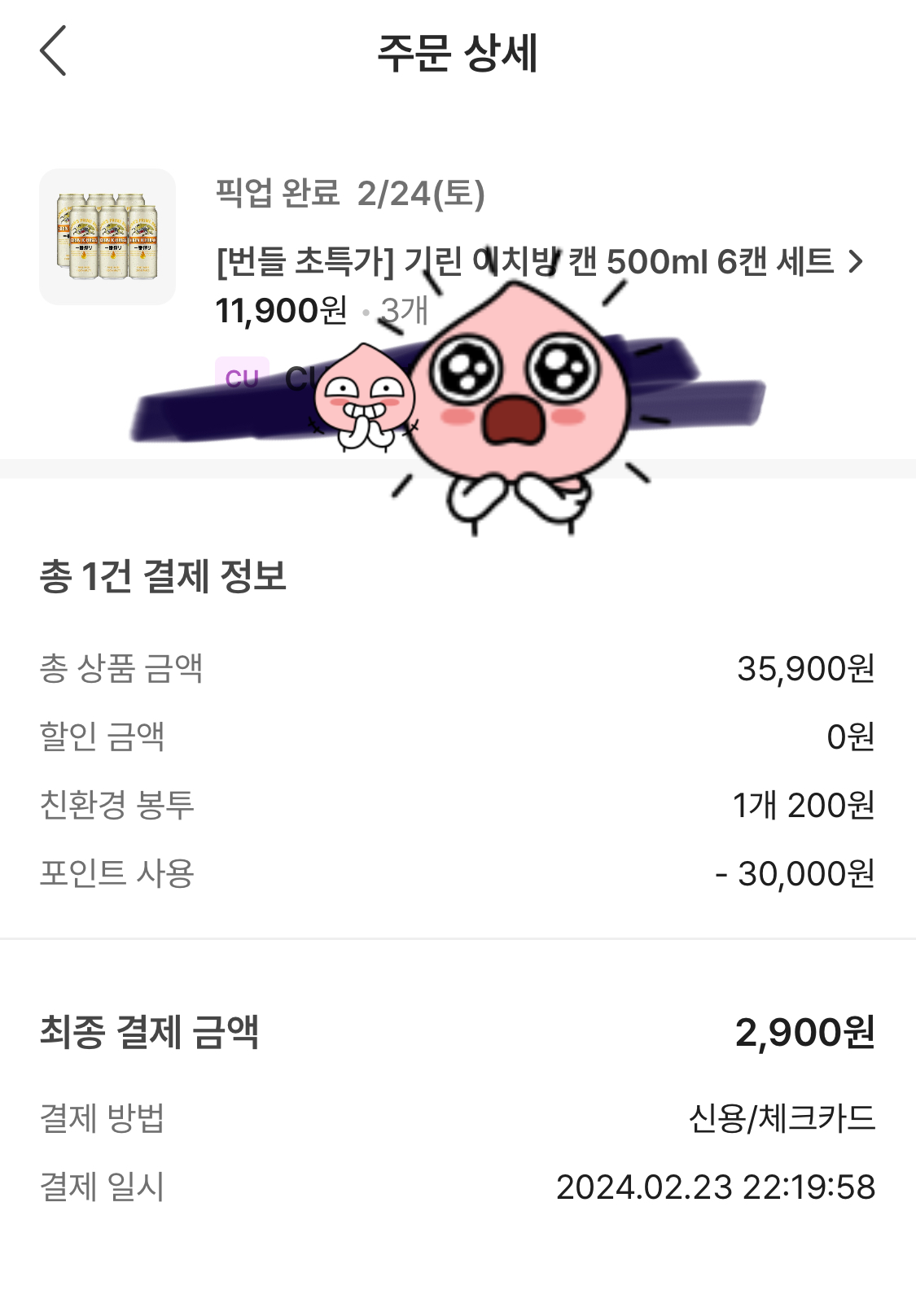 캡쳐로 보시다시피 포인트 3만원을 사용해서 2,900원만 결제한 상태로 기린 이치방 시보리 캔맥주 18캔을 말도 안되는 저렴한 가격에 구매했습니다. 정말 만족스럽네요.