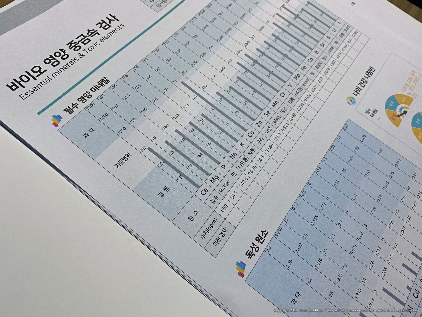 바이오 영양 중금속 검사 결과지는 먼저 필수 영양 미네랄인 칼슘, 마그네슘, 인, 나트륨, 칼륨, 구리, 아연, 셀레늄, 망간, 크롬, 바나듐, 몰리브덴, 철, 코발트, 붕소, 스트론튬, 황, 리튬 요오드가 신체에 얼마나 있는지 보여줍니다. 우선 모두 기준범위 내에서 결과가 나온듯 해서 다행이네요.