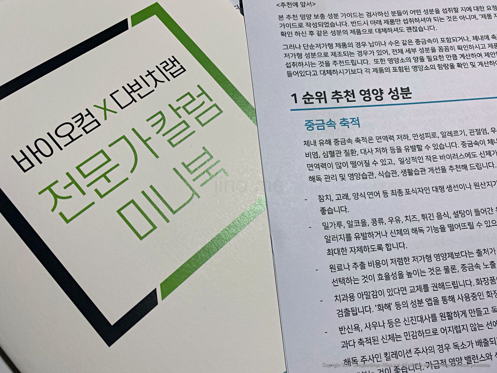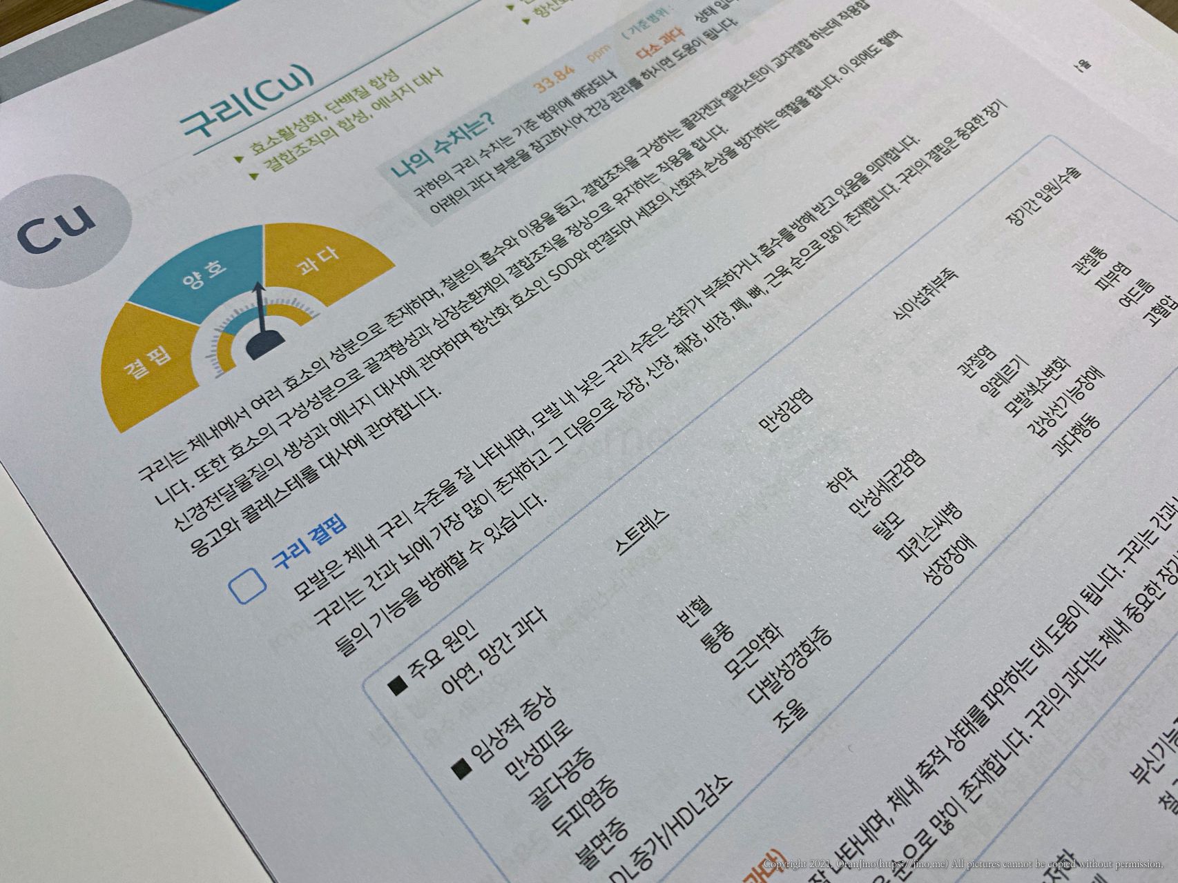 구리는 중금속이 아닌 필수 미네랄 중 하나인데 결핍되었을 때, 과디일 때 어떤 원인과 임상적 증상이 있는지 알 수 있습니다. 임상적 증상은 대체로 맞는 편인 것 같더라고요. 페스코 채식을 하는 터리 '지나친 채식 위주의 식사'도 원인으로 종종 나오는 것이 신기했습니다. 채식을 하면서도 필수 미네랄들을 골고루 섭취하기 위해선 아무래도 영양제품이 필요할 것 같은데 관련하여 영양 성분 추천도 받을 수 있어서 좋더라고요.