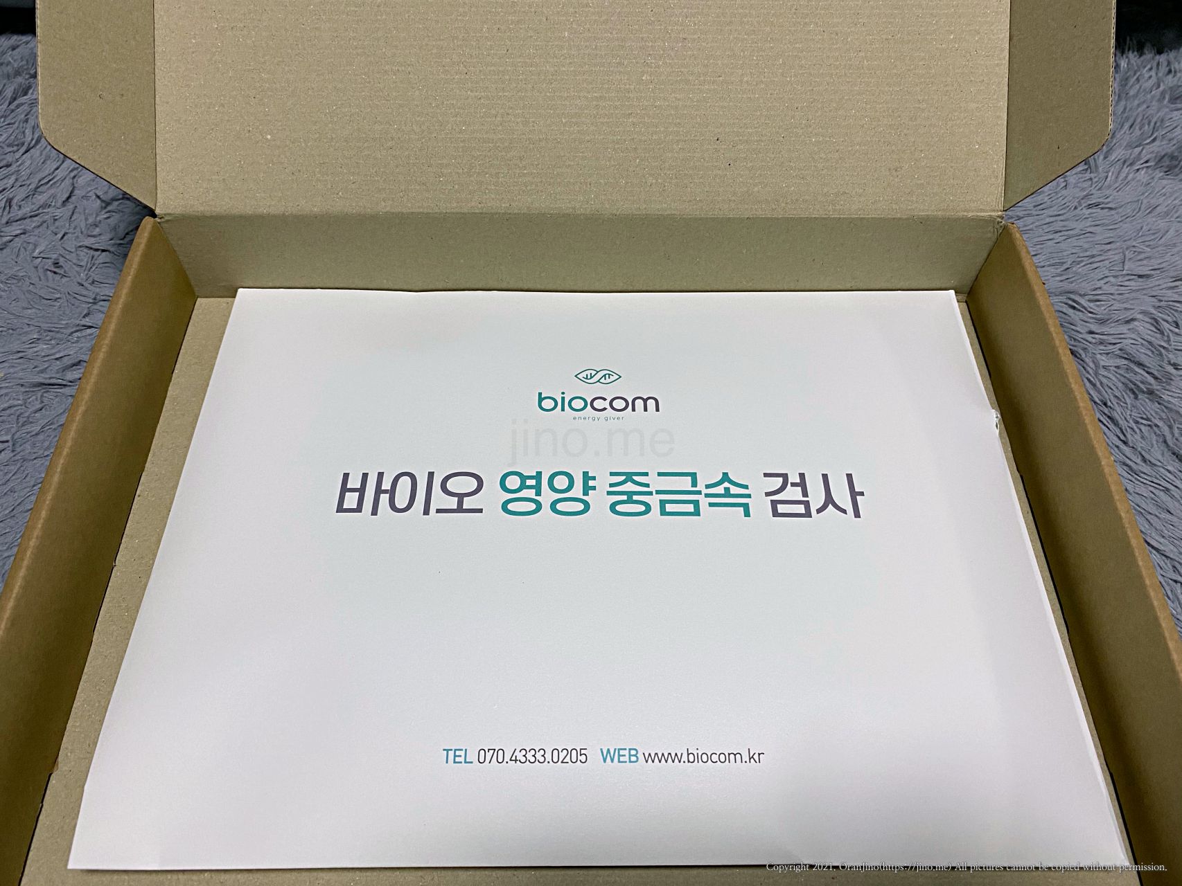 언박싱을 하면 biocom 바이오 영양 중금속 검사 대봉투가 나옵니다.