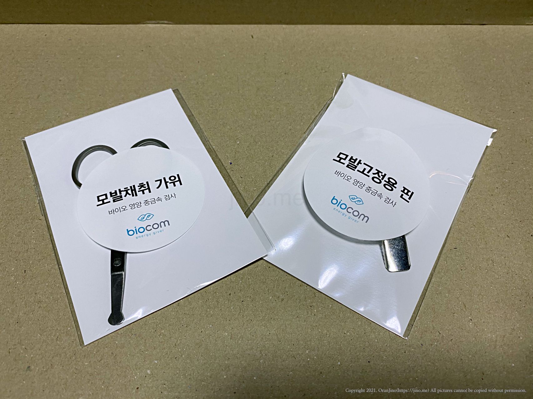 문진표를 작성하고 모발을 0.1g 채취하여 검사하게 됩니다. 우리의 소듕한 모발을 채취하는데 100g 이면 부담 없이 내어줄 수 있겠죠? 동봉된 모발고정용 핀과 모발채취 가위를 사용하게 됩니다. 사용하고 나면 이건 또 요긴하게 쓸 수 있겠죠.