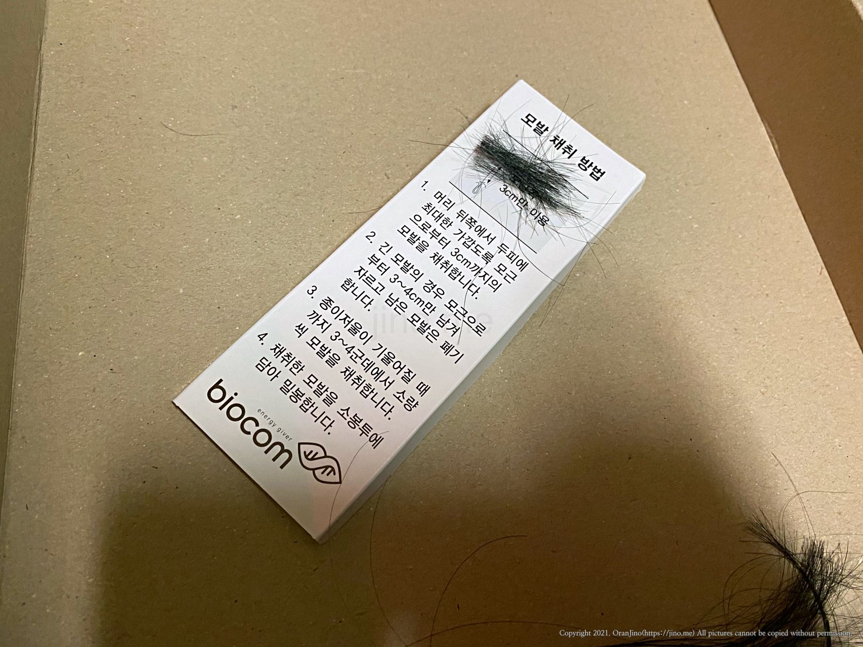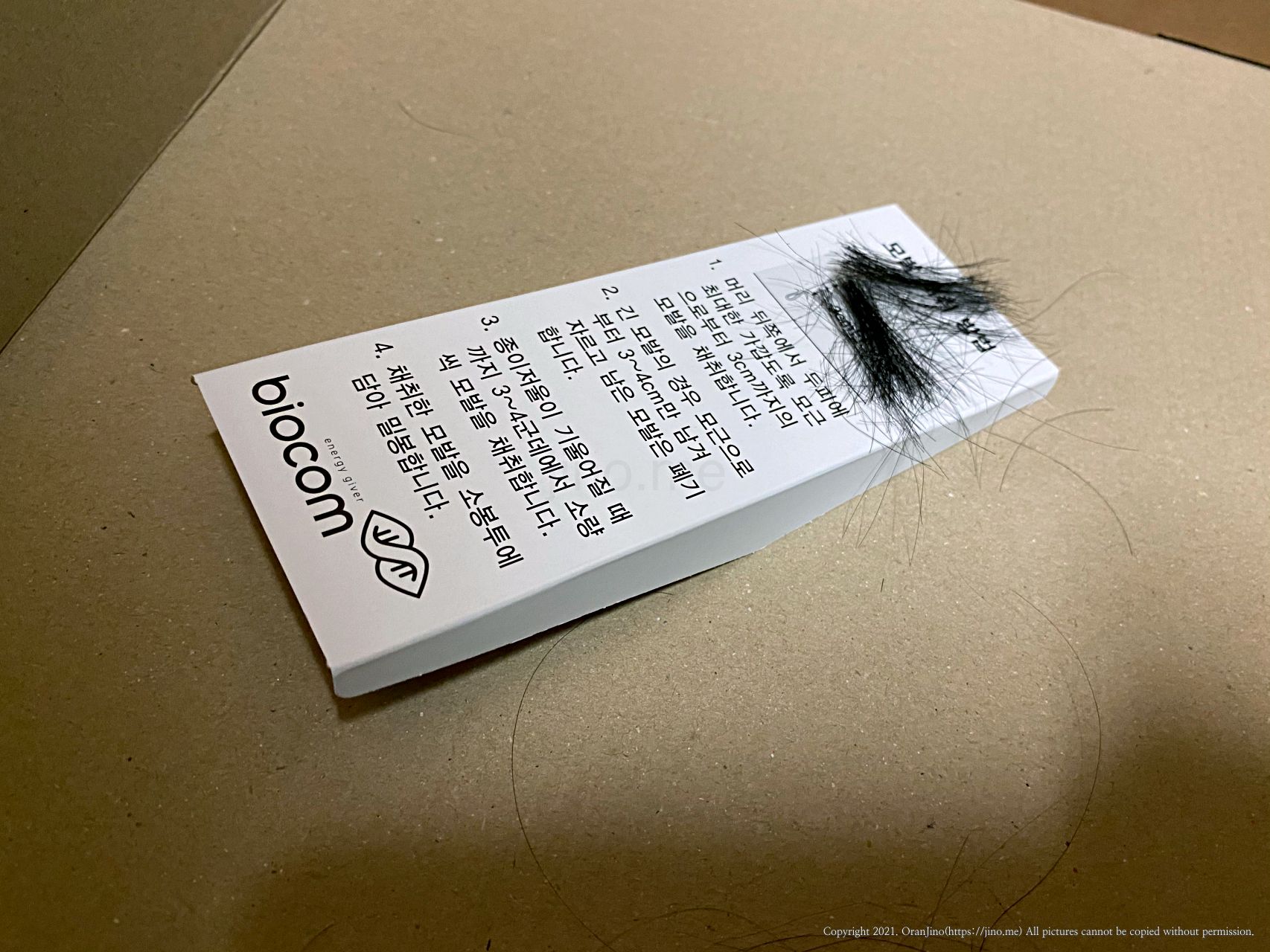 바이오컴 홈페이지를 통해 신청한 검사키트가 택배로 도착했습니다. 이제 가이드대로 머리카락을 채취하여 착불로 연구소에 보내면 끝~