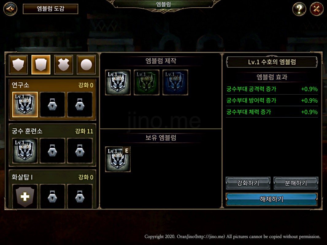 16렙으로 업그레이드했다면 엠블럼을 장착할 차례입니다. 엠블럼 기술서를 몇개나 보유하느냐에 따라 어떤 등급의 엠블럼을 제작할 수 있는지가 결정됩니다. 즉 엠블럼 기술서는 소모성 아이템이 아니니 명성 주화 상점에서 매주 최대 수량(3개)만큼 꾸준히 구입해 주시고, 여기에 연맹 임무나 도전의 문 등으로 획득하는 연마제를 통해 엠블럼을 제작합니다. 사용된 연마제는 해체를 통해 되돌릴 수도 있으니 우선 기술서 한개만으로 제작 가능한 엠블럼을 궁수부대에 맞춰 제작하도록 합니다.