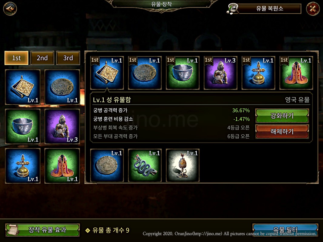 궁병 공격 버프가 있어 개인적으로 필수라 생각하는 모체 전사 토기(공통), 성 유물함(영국), 왕실의 보주(영국)은 다른 유물을 재료로 강화와 승급을 하여 버프를 최대한 받는 것이 좋습니다.