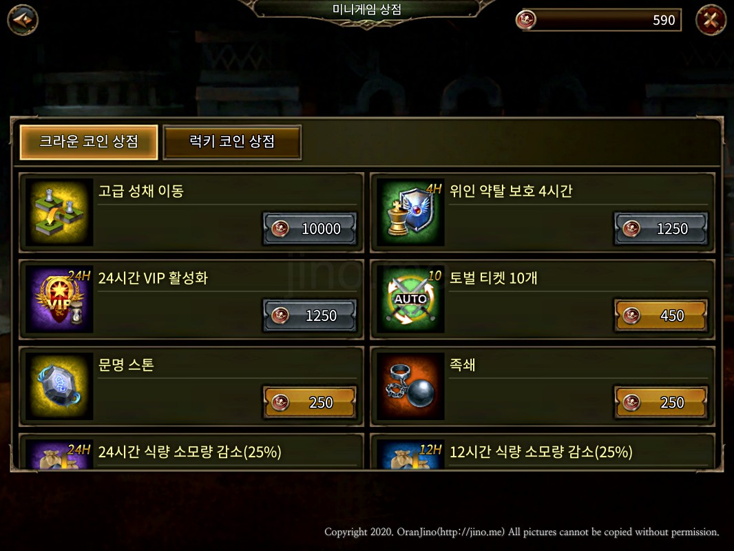 얘기가 나온 김에 크라운 코인, 럭키 코인 상점에선 족쇄 외엔 쳐다보니 말자는 것이 제 신조입니다. 족쇄를 통해 감옥을 업그레이드 하면 건물 강화를 통해 모든 부대의 공격력을 올릴 수 있기 때문이죠. 골드나 연맹 상점에서도 살 수 있는 걸 구매하여 족쇄 (족쇄를 다 사면 문명 스톤 정도) 를 살 기회를 놓치지 않도록 합니다.