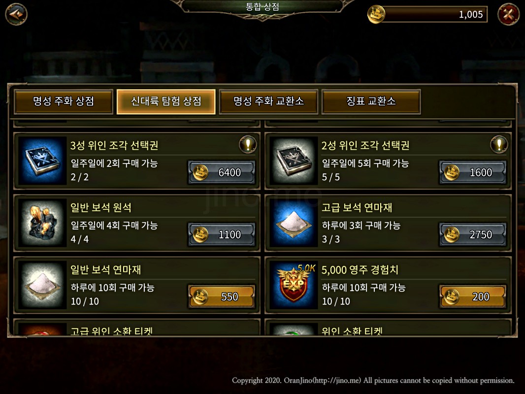 신대륙 지도를 확보하신 분이 계시다면 jino@jino.me 전달해주시면 대단히 감사드리겠습니다. 신대륙 탐험으로 얻은 주화로는 보석 원석과 연마재를 구매하는데 사용합니다. 일주일에 구매 가능한 수량을 모두 구입한 상황이 아니라면 절대 다른 물품을 사지 않도록 합니다. 후회만 따라올 뿐입니다. 보석은 성채 17레벨부터 활용하게 됩니다.