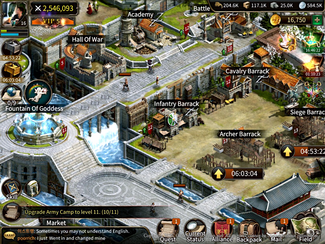 이제 건물 업그레이드는 시간이 오래 걸려 여유가 강제로 생깁니다. 퀘스트, 내정임무, 특별임무에 맞춰 조금씩 자원도 모으며 성장해갑니다. 하루 3번 무료로 가능한 시련의 관문의 경우 퀘스트가 떴을 때만 진행하는 방법 등으로 효율적인 운영 노하우가 필요합니다. (여신 소원은 그 날 더 업글레이드 예정이 있다면 올린 뒤에 하는 것도 방법입니다. 어차피 나중엔 의미 없는 내용)고렙이 많은 연맹이라면 도적단 소굴 토벌에 참여하여 영주 레벨을 빠르게 올릴 수 있는데, 사실 현재 토벌에 도움이 되는 병력이 안되기에 도움을 받는 것에 대해 고마워할 줄 알아야 합니다.사실 높은 레벨의 도적단 소굴 토벌에는 최소 3티어(혹은 4티어) 이상만 보내는 게 맞거든요.