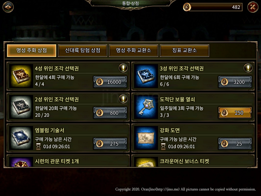 또한 명성 주화 상점에서는 엠블럼 기술서와 강화 도면만 구매합니다. 일주일에 구매 가능한 수량을 다 채웠을 경우에만 다른 걸 사도록 합니다. 후회하지 않으려면!