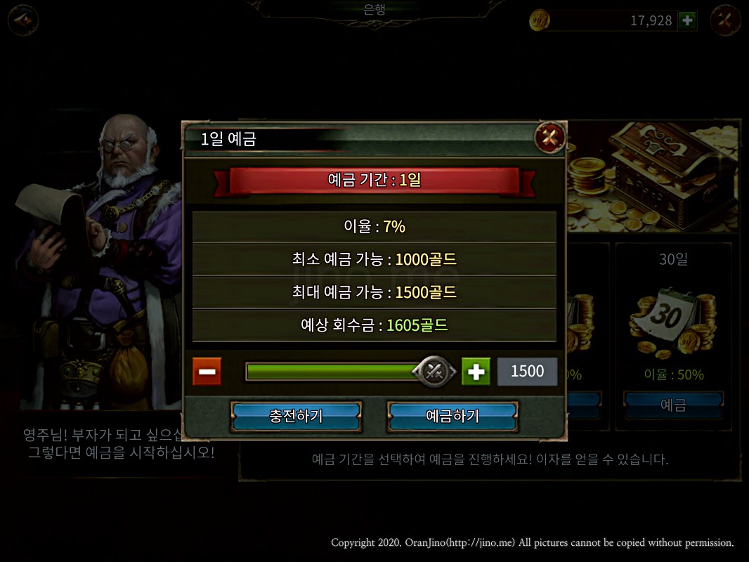 이 게임은 현질로 VIP 등급을 올려놓고 시작하는 게 유리합니다. 적어도 0.99달러는 현질을 해야 일단 은행 통해 매일 105골드를 얻을 수 있는 이점도 있지요.