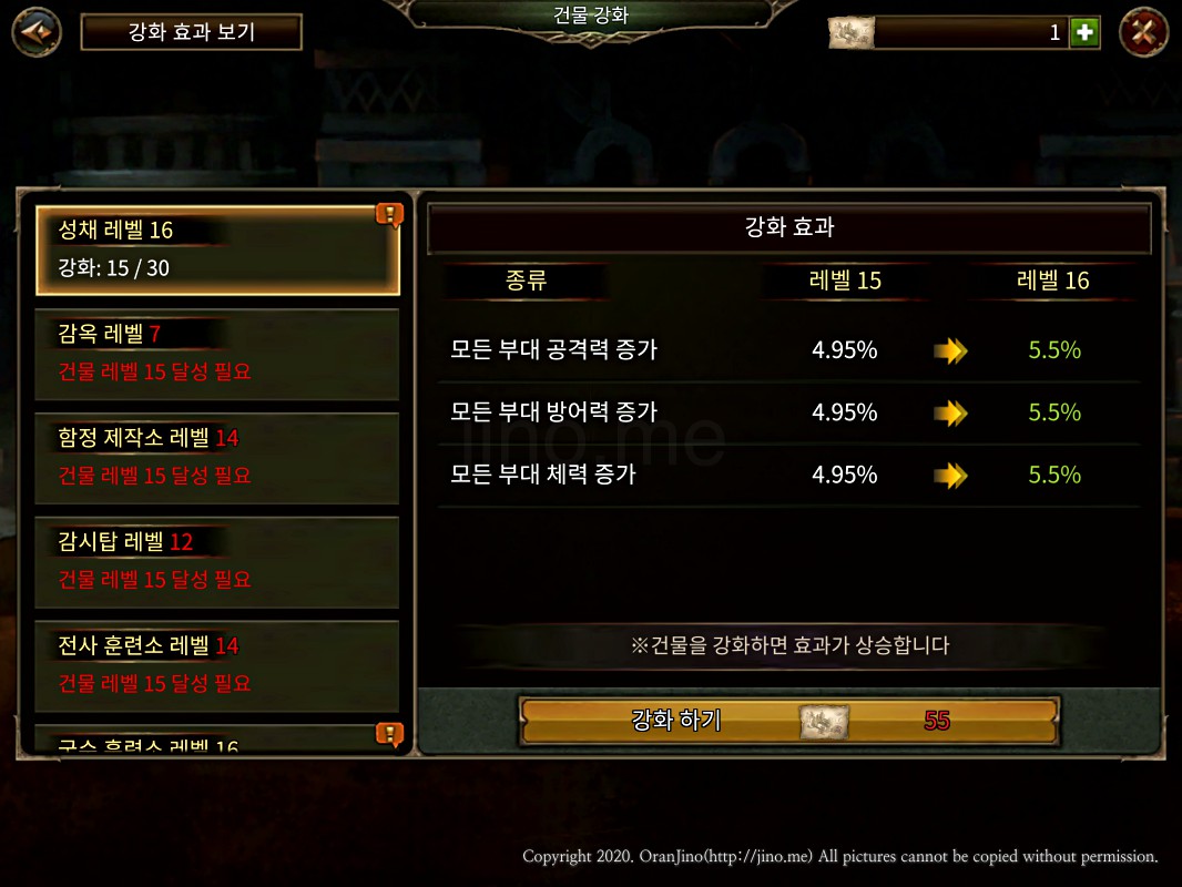 성채와 같이 모든 병력의 공/방/체를 올려주는 강화를 해주고, 특수 아이템이 필요한 감옥, 전쟁의 전당은 모든 병력의 공격력으로 올려주기에 또한 중요합니다.