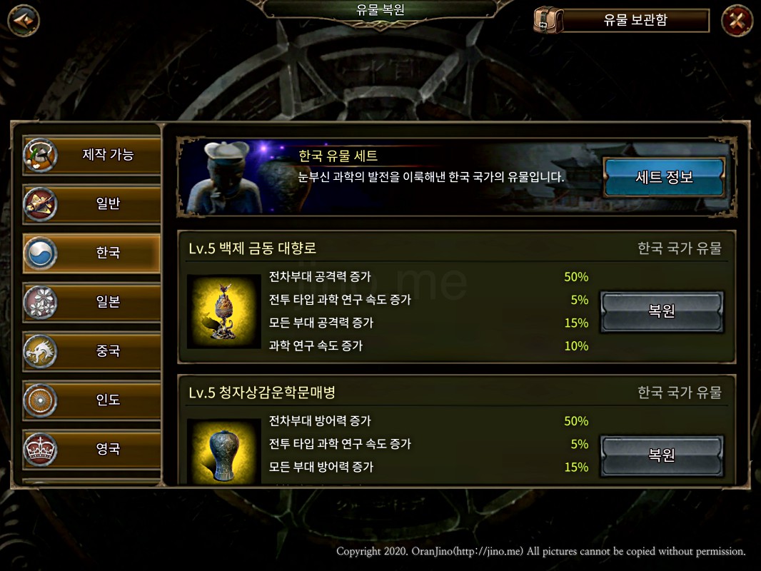 국가별 유물은 해당 특수 병사에 대한 버프가 붙어있어 활용하기에 좋습니다.