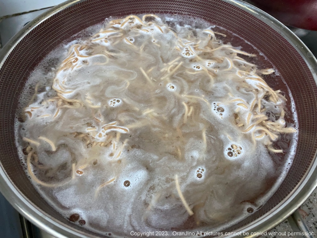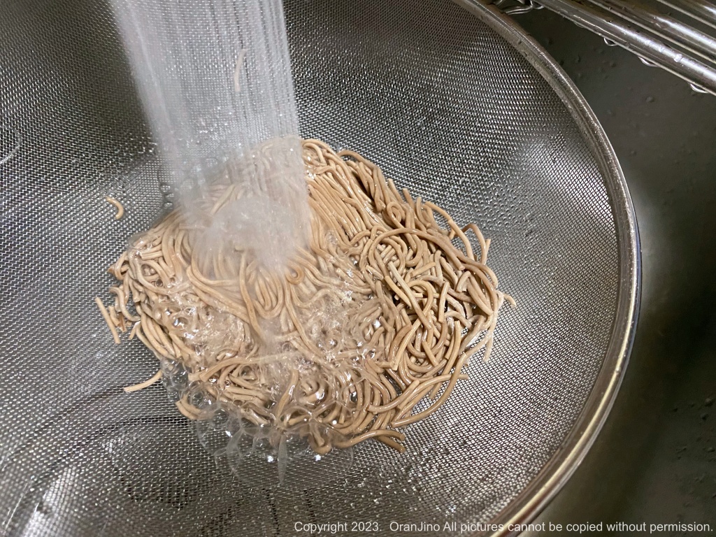 먼저 봉평 메일 막국수면을 흐르는 물에 씻어 전분을 빼준 뒤 끓는 물에 삶아줍니다. 제가 쓰는 팬은 이연복 쉐프와 같은 건데 늘 만족하며 사용하고 있습니다.