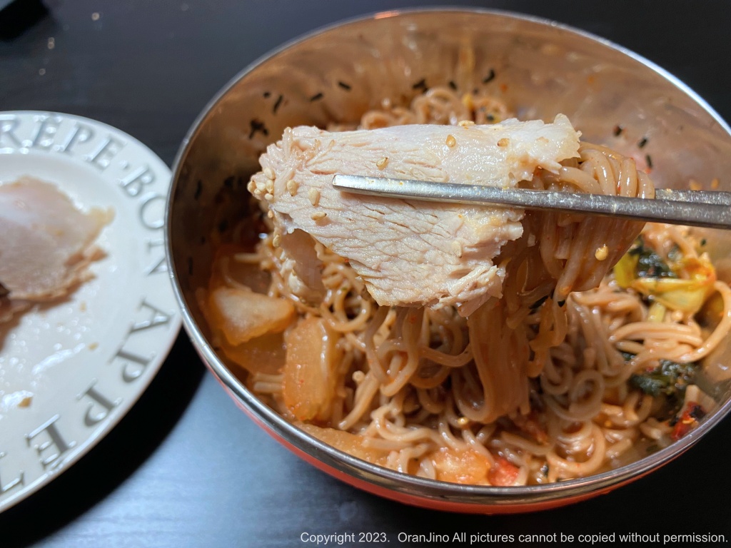 돼지고기 삼겹살의 야들야들한 수육에 막국수 면을 싸 먹으면 을매나 맛있게요!