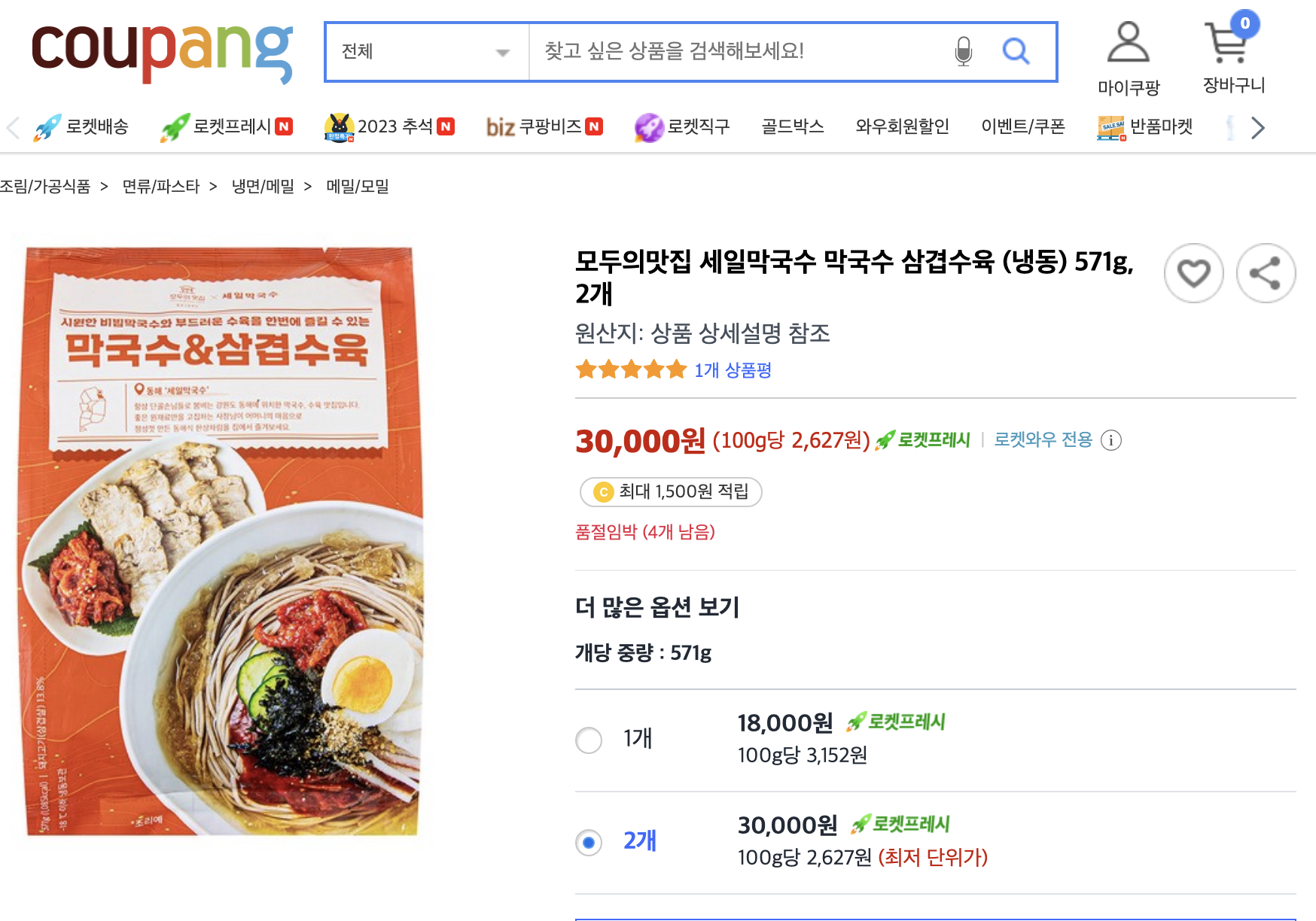 쿠팡 로켓프레시 / 로켓와우 전용으로 판매되는 모두의맛집 세일막국수 막국수 삼겹수육 (냉동) 571g 가격은 2개에 3만원입니다. 아래 이미지를 클릭하시면 상품을 보실 수 있습니다.