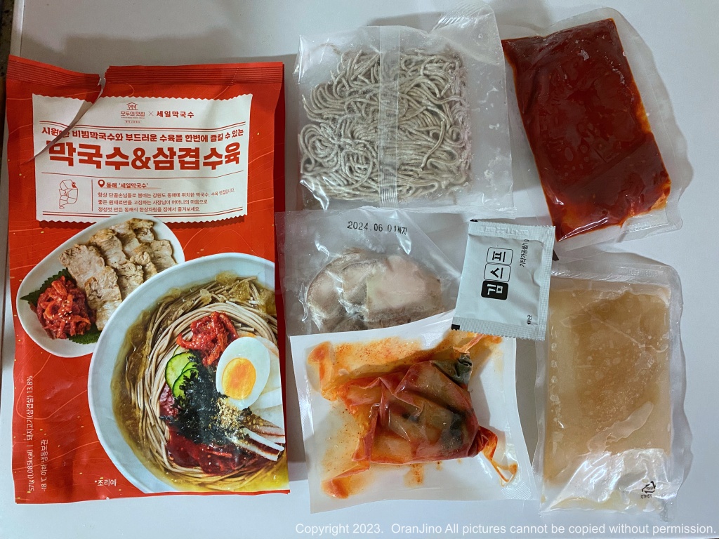 세일막국수 밀키트 구성은 이렇게 막국수 면, 돼지고기 삼겹살 수육, 양념 소스, 육수, 무김치/북어포 고명, 김스프가 알차게 준비되어 있습니다.