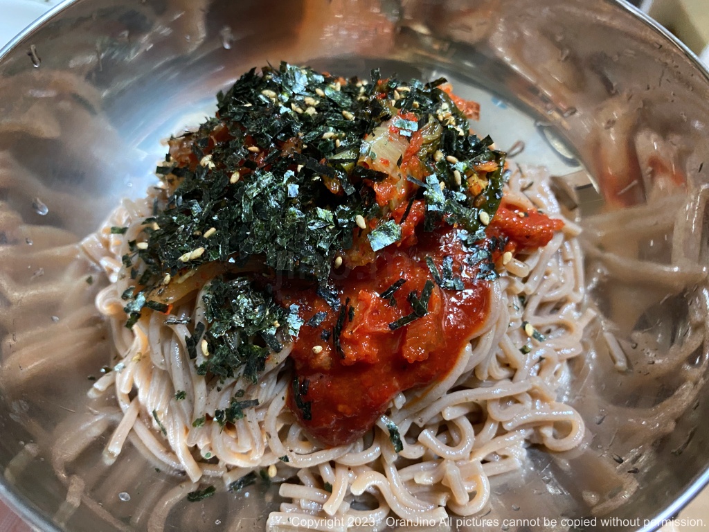 먼저 봉평 메일 막국수면을 흐르는 물에 씻어 전분을 빼준 뒤 끓는 물에 삶아줍니다. 제가 쓰는 팬은 이연복 쉐프와 같은 건데 늘 만족하며 사용하고 있습니다.
