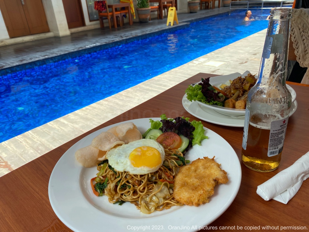 1층에 머무르면 이렇게 음식도 수영장 옆에서 먹을 수 있습니다. 볶음면을 뜻하는 미고렝과 인도네시아 가정식인 가도가도와 맥주를 먹었는데 그리 비싸지 않았습니다.