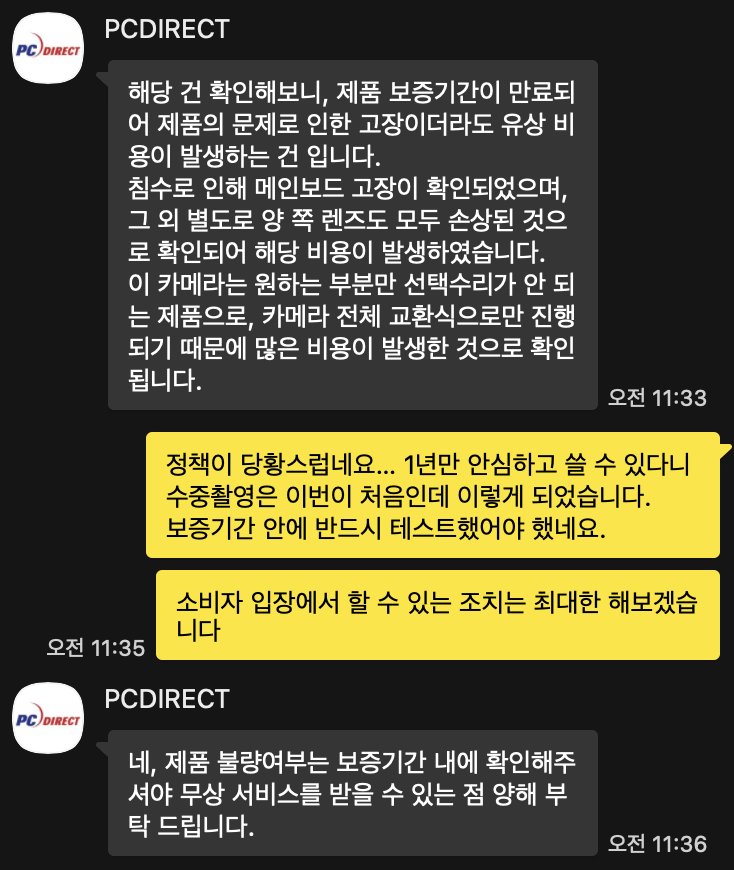 도대체 수심 1미터도 안 되는 물에서 어떻게 메인보드와 렌즈 양쪽이 동시에 망가질 수 있는 걸까요?