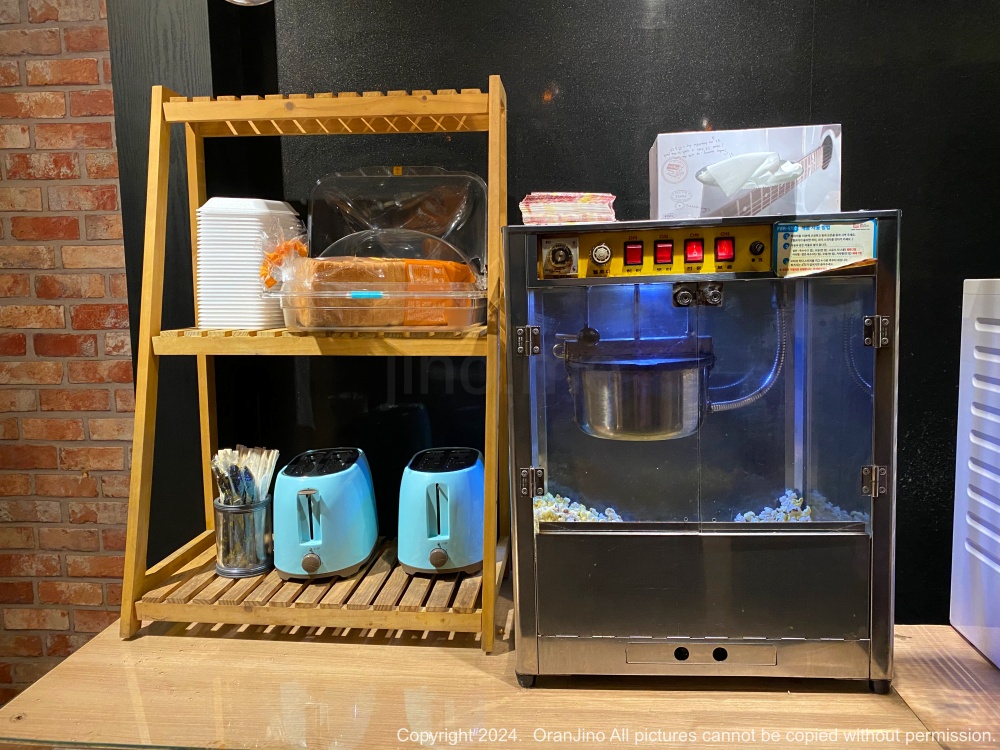 지금부터 부천 S호텔 실제 이용후기를 전합니다. 우선 체크인 후 엘리베이터 앞에서 맛있는 냄새가 났는데, 팝콘 기계와 식빵, 토스트기와 커피 등이 있었습니다. 편하게 먹을 수 있도록 무료로 제공되고 있었습니다.