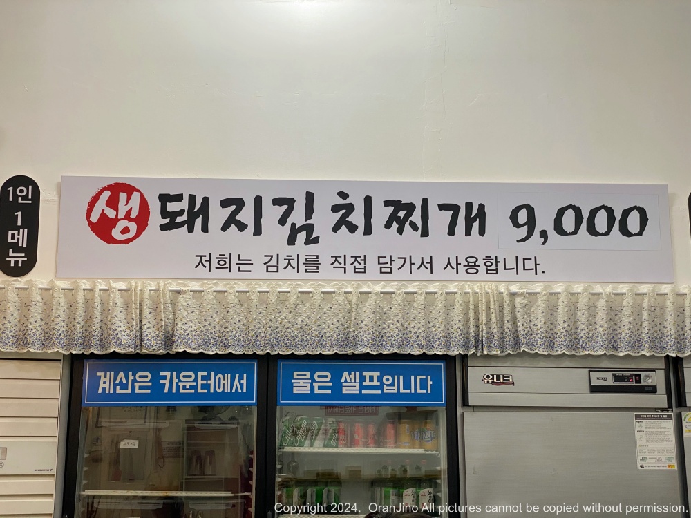 메뉴가 생돼지김치찌개 하나뿐이라 뭔가 제대로 하는 것 같은 느낌이 드는 이 곳은 1인 1메뉴 필수인데 9천원이라 괜찮은 가격으로 보입니다. 김치를 직접 담가 서비스하는 곳이라 믿음이 가네요.
