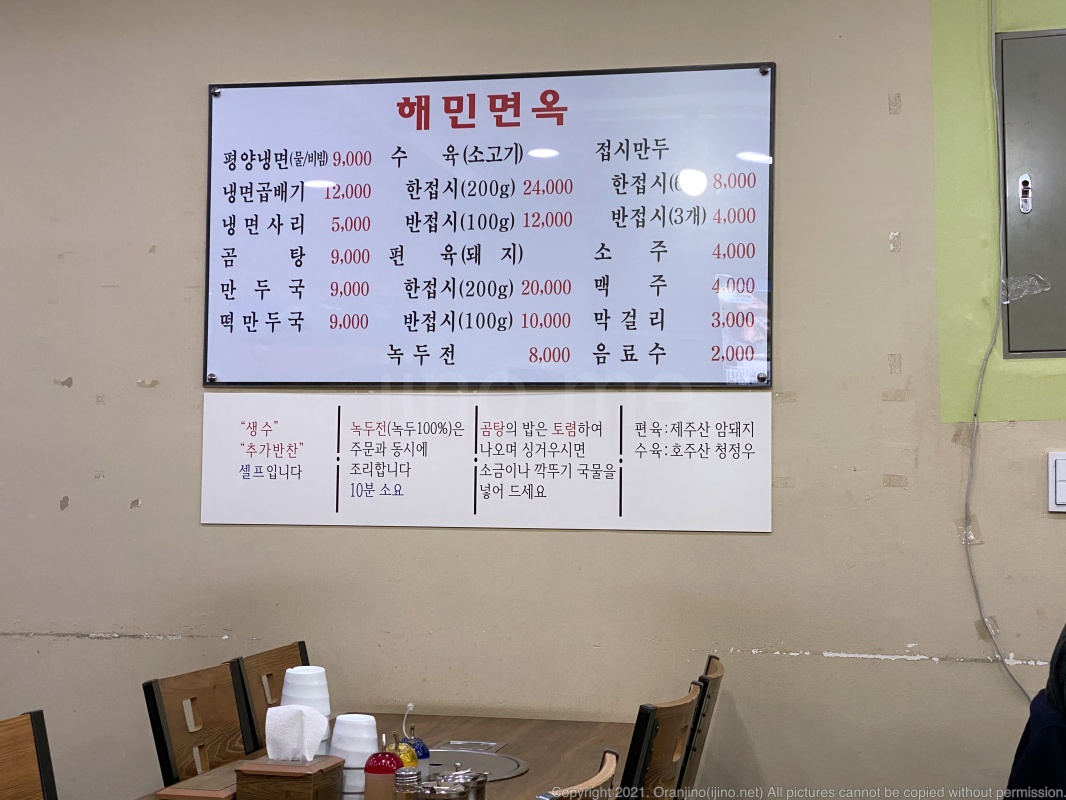 해민면옥의 평양냉면 가격은 9천원. 비싼 우래옥의 절반 정도 수준의 가격이죠.