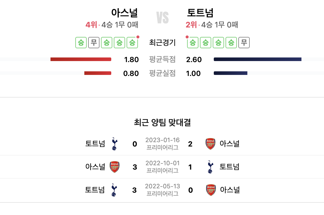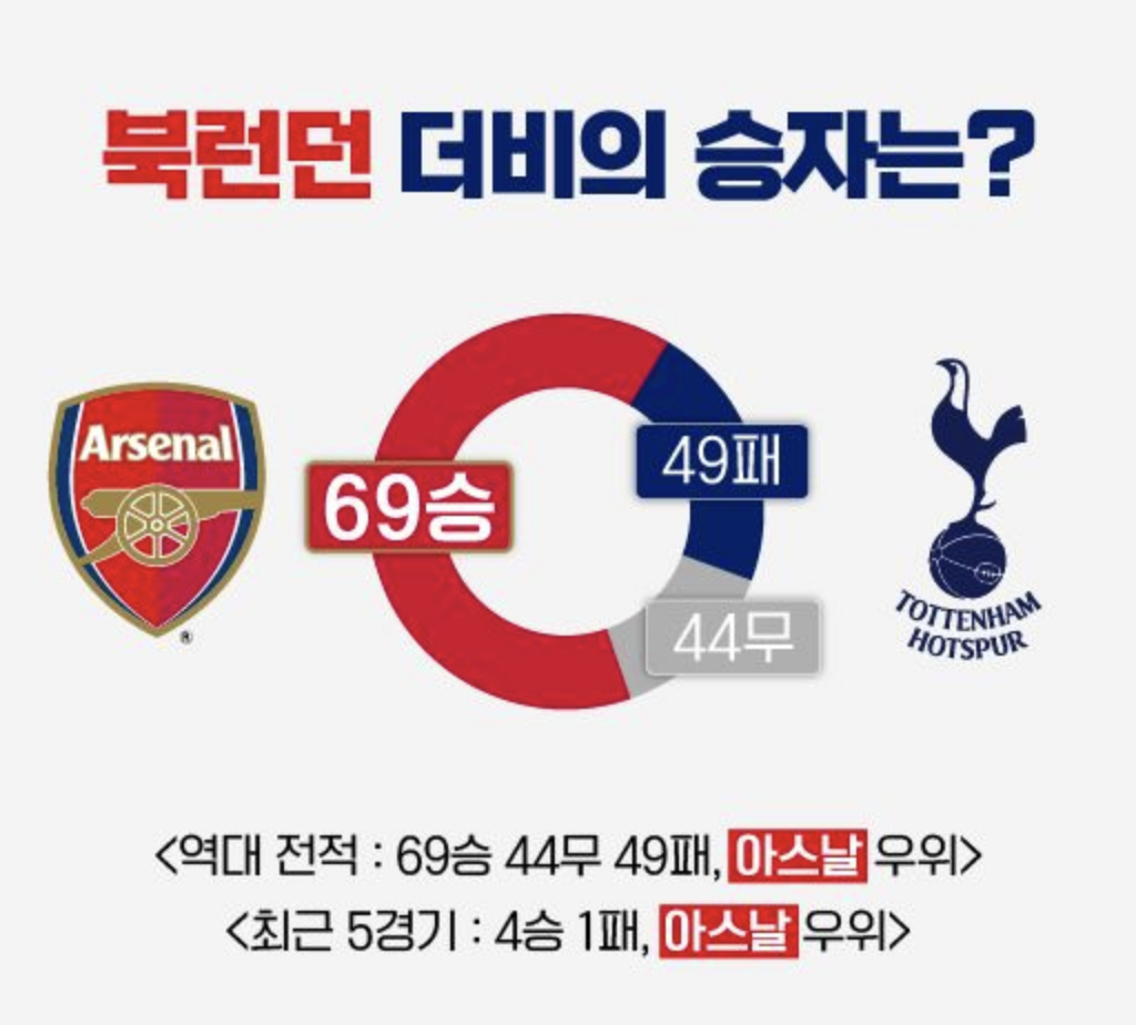 토트넘 홋스퍼는 토트넘 홋스퍼 스타디움에서, 아스널은 에미레이트 스타디움에서 홈 경기를 치릅니다. 역대 전적은 토트넘의 66승, 아스널의 82승, 그리고 53번의 무승부로 이루어져 있습니다.