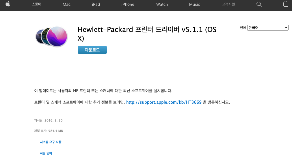 목록에 없다면 아래 애플 지원 링크를 통해 HP 프린트 드라이버를 설치해야 합니다.