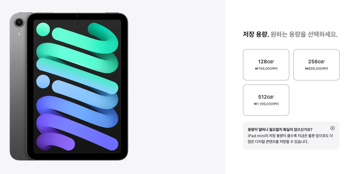 새로운 iPad mini는 블루, 퍼플, 스타라이트, 스페이스 그레이 색상으로 출시되며, 가격은 Wi-Fi 모델 749,000원, Wi-Fi + Cellular 모델 979,000원부터 시작합니다. 기본 저장 용량은 128GB이며, 256GB 및 512GB 옵션도 선택할 수 있습니다. 2024년 10월 23일부터 공식 출시 되었습니다.