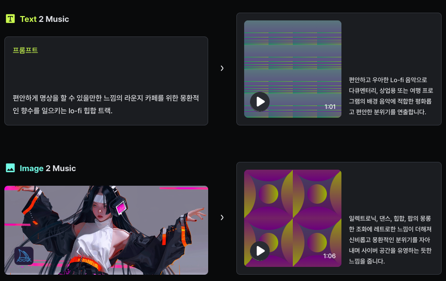 아래와 같이 어떤 사운드, 혹은 음악과 비슷한 느낌의 음원을 생성할 수도 있고, 원하는 이미지와 설명을 통해 보다 의도에 가깝게 음원을 만들 수도 있습니다.