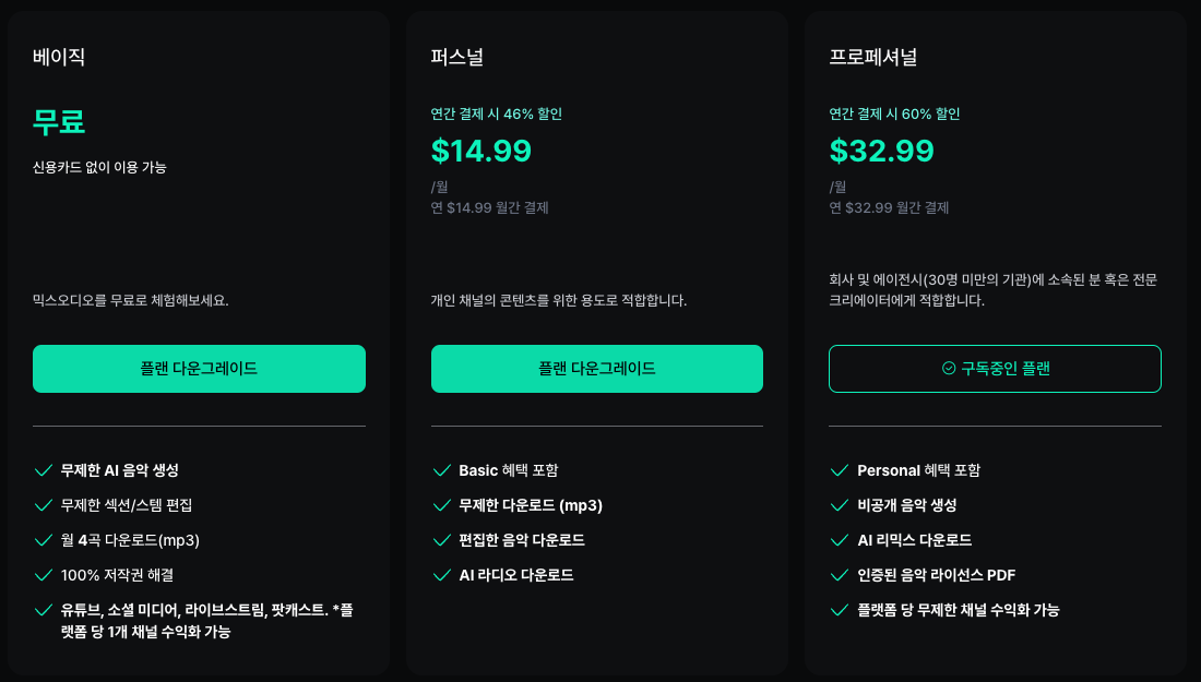 무료버전에서도 음악 생성은 얼마든 할 수 있지만, mp3 다운로드나 리믹스 다운로드 등 퍼스널 혹은 프로페셔널 구독으로만 할 수 있는 기능들이 있습니다.