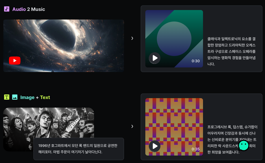아래와 같이 어떤 사운드, 혹은 음악과 비슷한 느낌의 음원을 생성할 수도 있고, 원하는 이미지와 설명을 통해 보다 의도에 가깝게 음원을 만들 수도 있습니다.