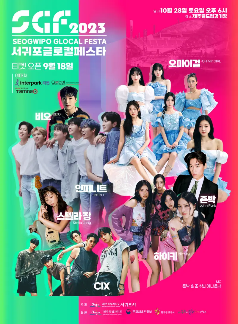서귀포 글로컬 페스타 SGF 2023 10월 28일 토요일 오후 6시 제주월드컵경기장. 출연진: 비오, 오마이걸, 인피니트, CIX, 하이키, 존박, 스텔라장