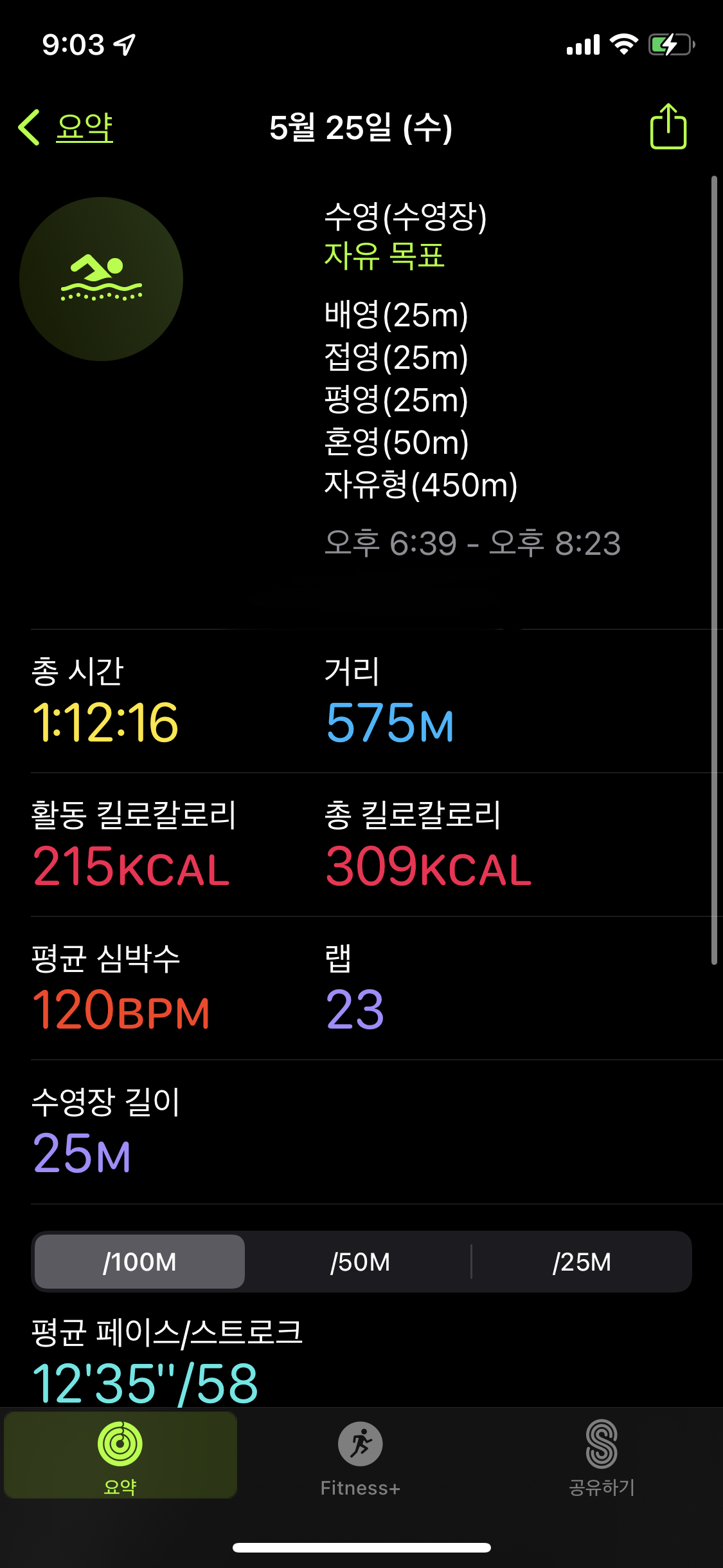 그리고 수영 거리는 GPS로 측정하는 것이 아니라 팔동작으로 측정합니다. 유아풀장 제자리에서 자유형 팔 돌리기만 주구장창 했더니 자유영 500M를 수영한 것으로 기록되었네요. 동작을 인식하여 영법을 캐치해서 기록하는 방식입니다. 하루 목표로 설정된 300 칼로리 링 완성은 쉽게 할 수 있었습니다.