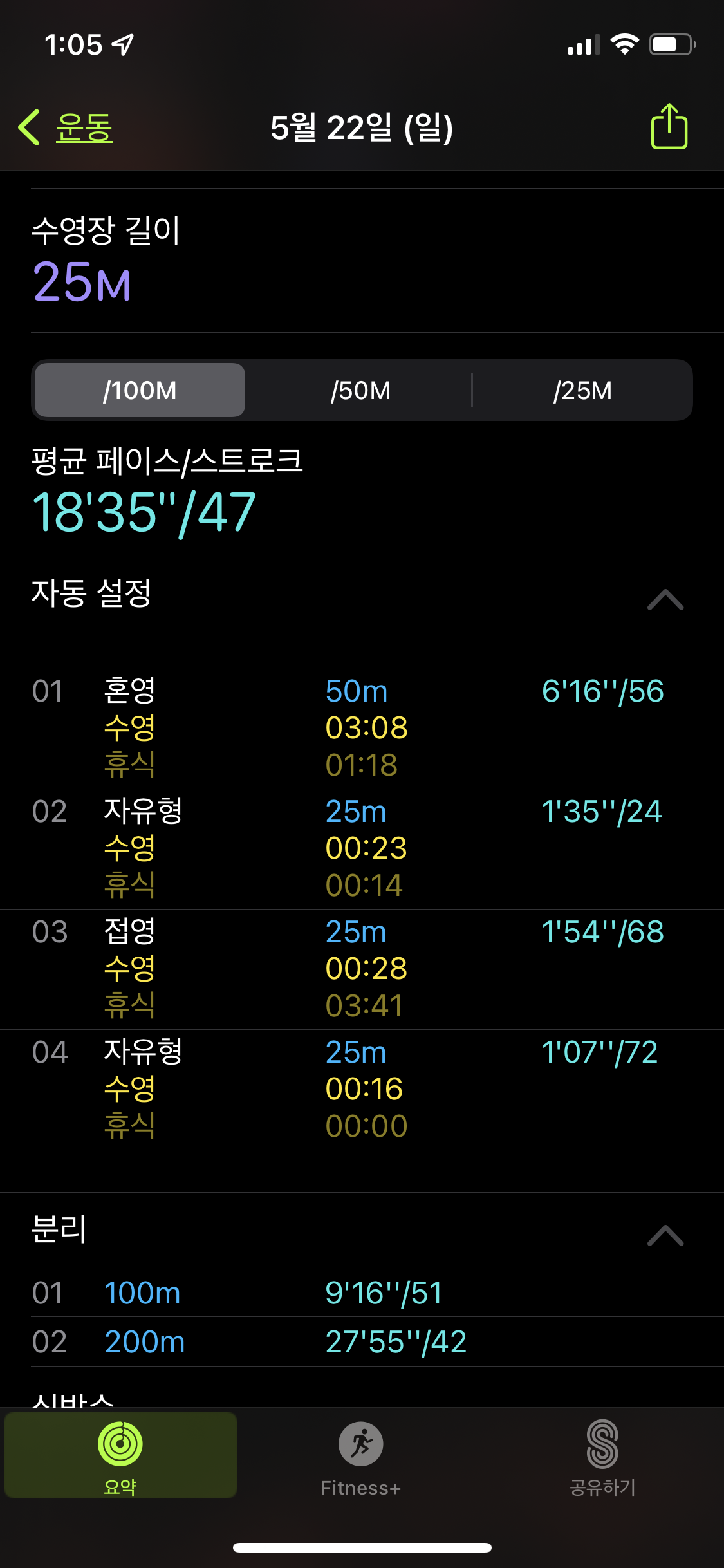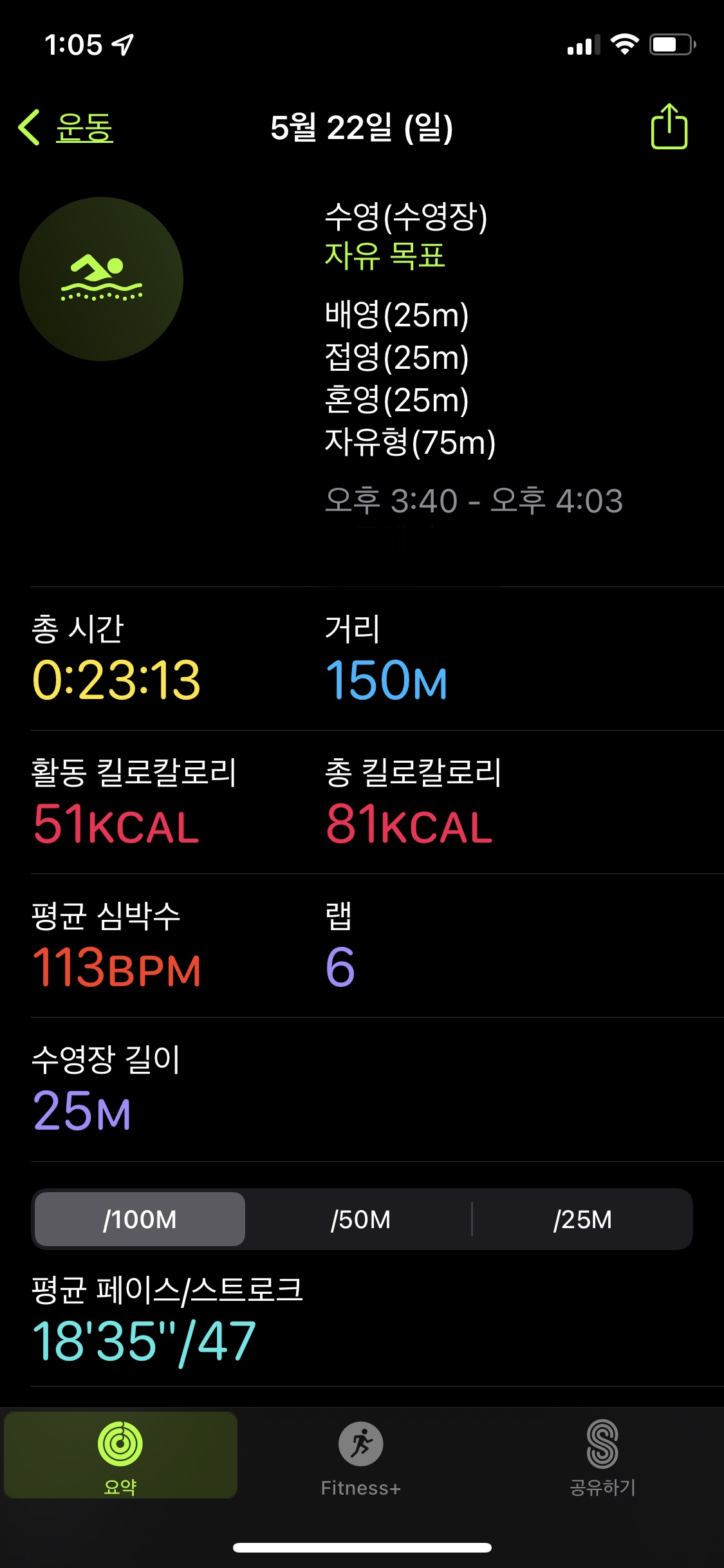 배영, 접영, 혼영, 자유형을 했다고 나오지만 전 그저 킥판 잡고 왔다갔다 했을 뿐입니다 ㅋㅋ 그래서인지 랩도 제대로 기록되지 않았습니다. 팔 동작을 인식하여 영법을 측정하는 것 같습니다.
