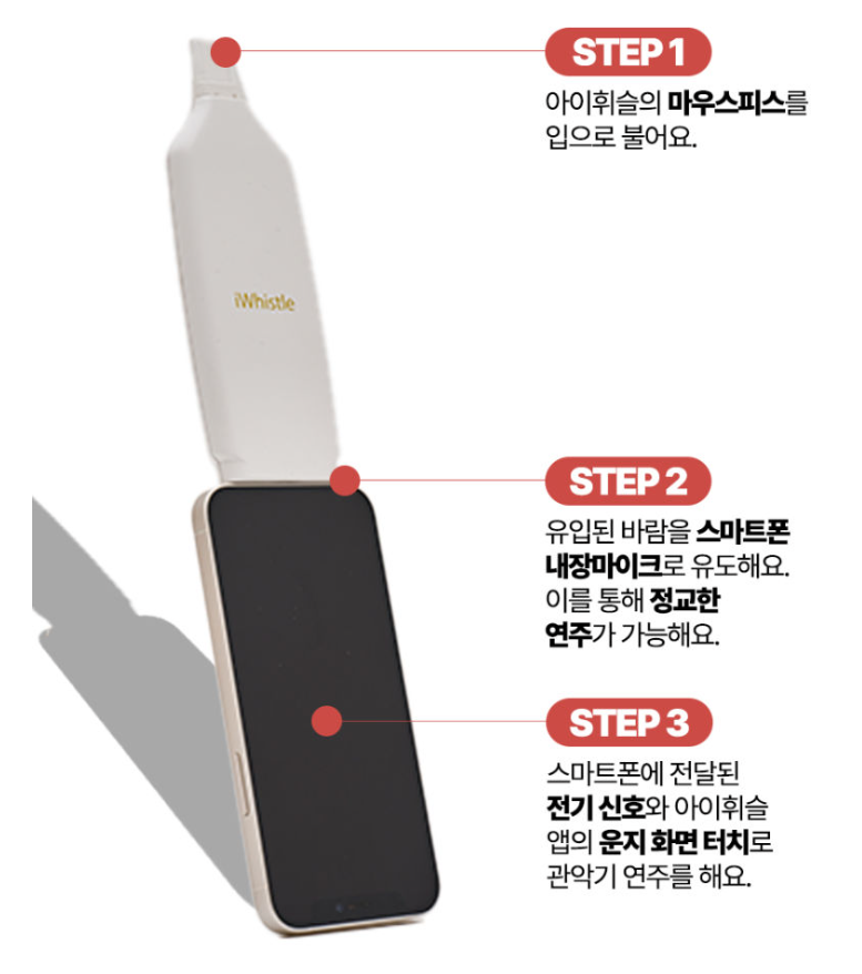 - 유입된 바람을 스마트폰 내장마이크로 유도해요. 이를 통해 정교한 연주가 가능해요.