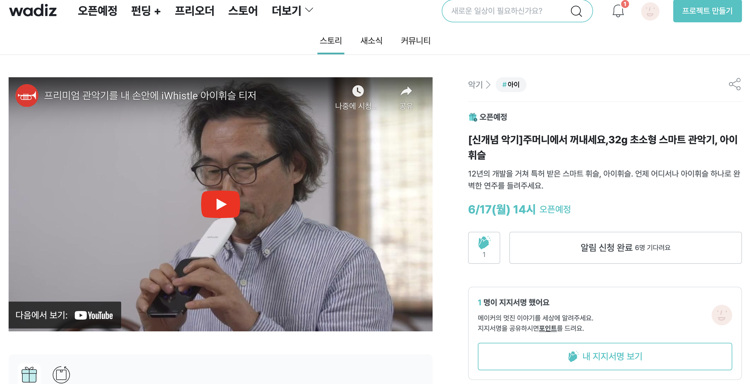 저 오렌지노가 1호 엠베서더로 활동하는 스마트관악기 아이휘슬의 와디즈 펀딩일인 2024년 6월 17일을 앞두고 오픈 예정으로 페이지 등록이 되었습니다.